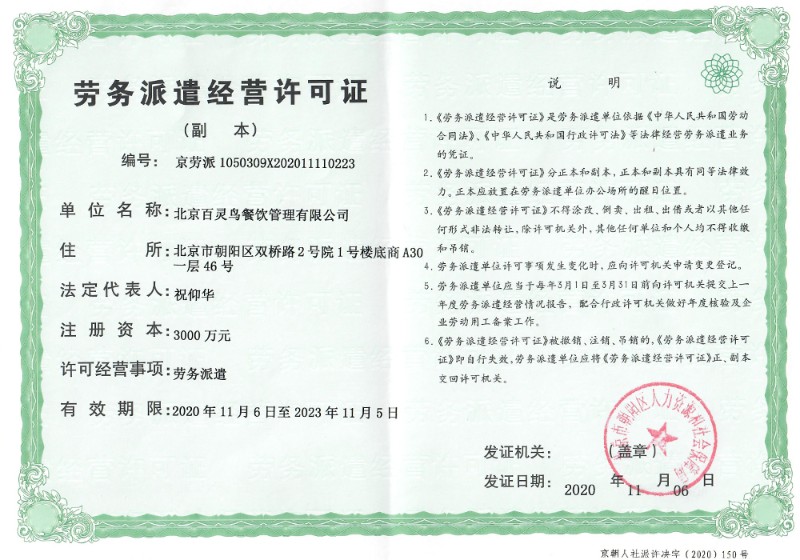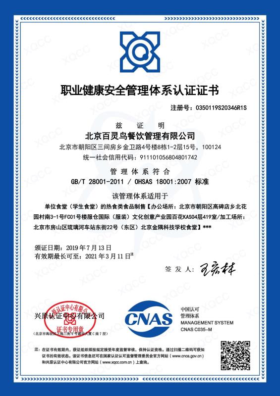 北京百靈鳥餐飲管理有限公司榮譽資質證書展示
